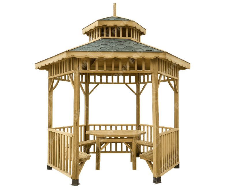 Bahçenize, verandanıza veya açık hava yaşam alanlarınıza estetik ve fonksiyonellik katacak, 400 cm taban çapına ve 460 cm çatı izdüşüm çapına sahip sekizgen ahşap kameriyemizle tanışın! Doğayla iç içe huzurlu anlar yaşamak isteyenler için özel olarak tasarlanan bu kameriye, dayanıklılığı ve şık görünümü bir araya getiriyor.